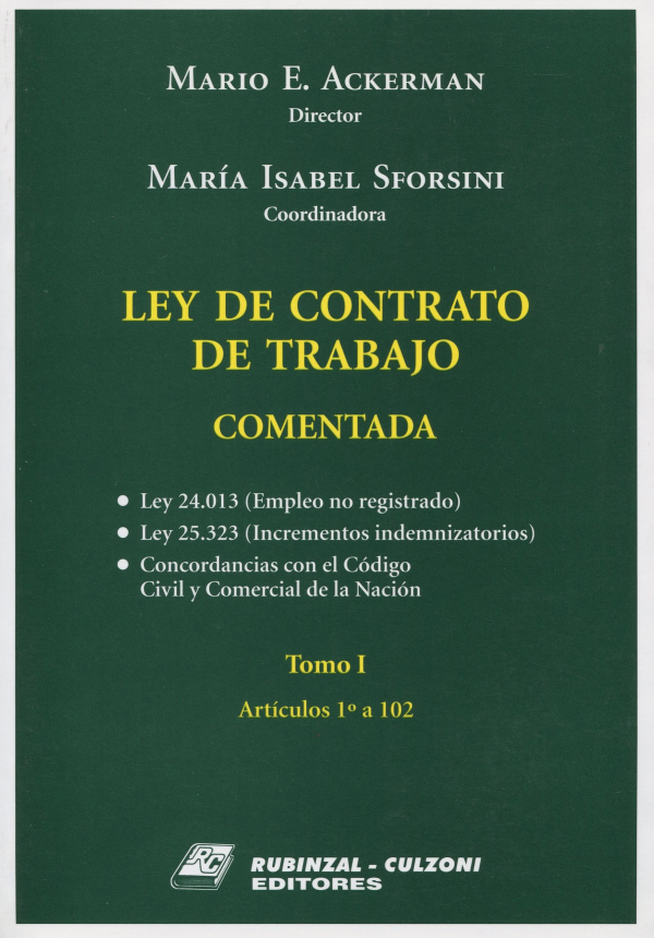 Ley de contrato de trabajo : comentada : ley 24.013 (empleo no registrado) : ley 25.323 (incrementos indemnizatorios) : concordancias con el Código Civil y Comercial de la Nación : tomo I : artículos 1º al 102.