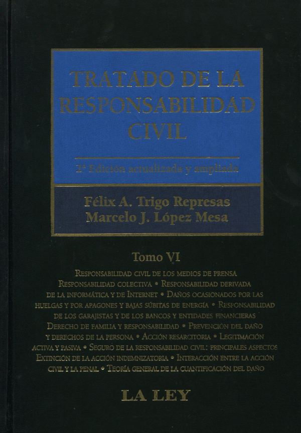 Tratado de la responsabilidad civil : tomo VI : responsabilidad civil de los medios de prensa : responsabilidad colectiva : responsabilidad derivada de la informática y de Internet : daños ocasionados por las huelgas y por apagones y bajas súbitas de energía : responsabilidad de los garajistas y de los bancos y entidades financieras : el derecho de familia y responsabilidad : previsión del daño y derechos de la persona : acción resarcitoria : legitimación activa y pasiva : seguro de la responsabilidad civil : principales aspectos : extinción de la acción indemnizatoria : interacción entre la acción civil y la penal : teoría general de la cuantificación del daño.