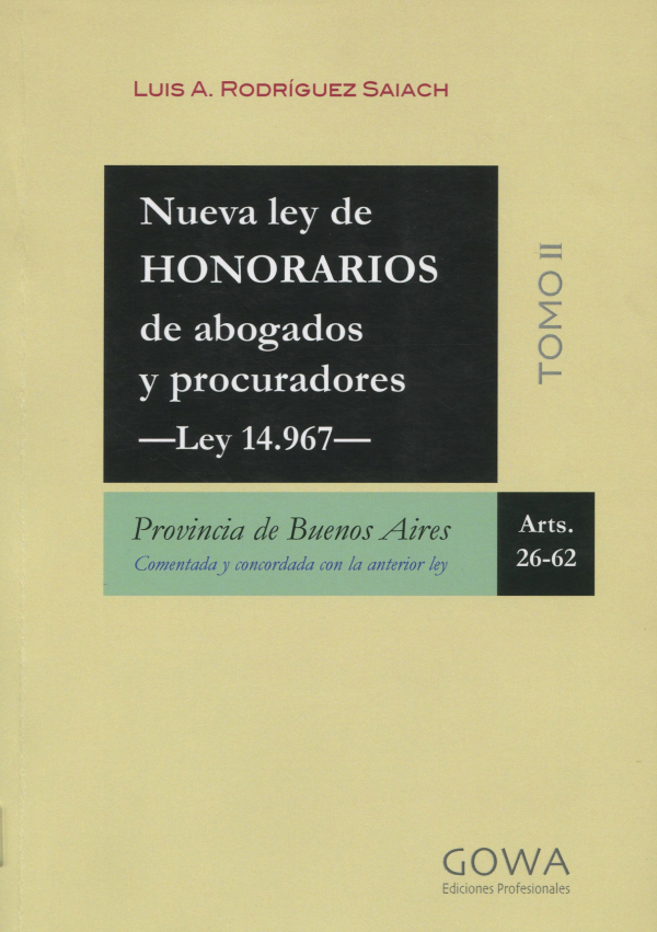 Nueva ley de Honorarios de abogados y procuradores : ley 14967 - Provincia de Buenos Aires comentada y concordada con la anterior ley : tomo II : arts. 26-62.
